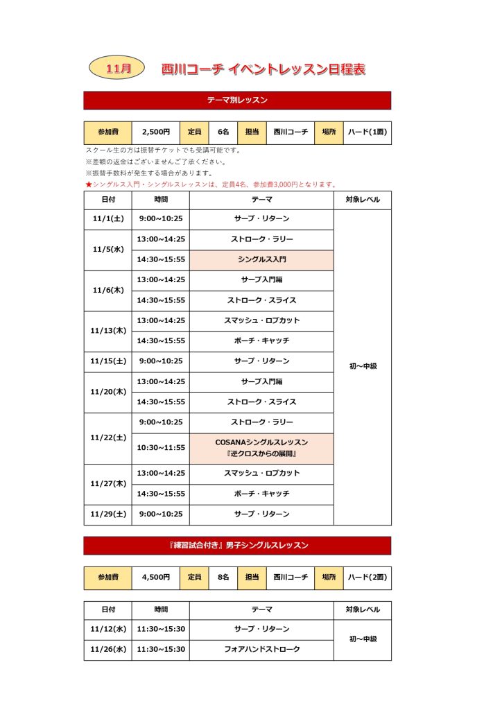 大好評のテーマ別レッスン、練習試合付きレッスン、11月も開催いたします…!🤩