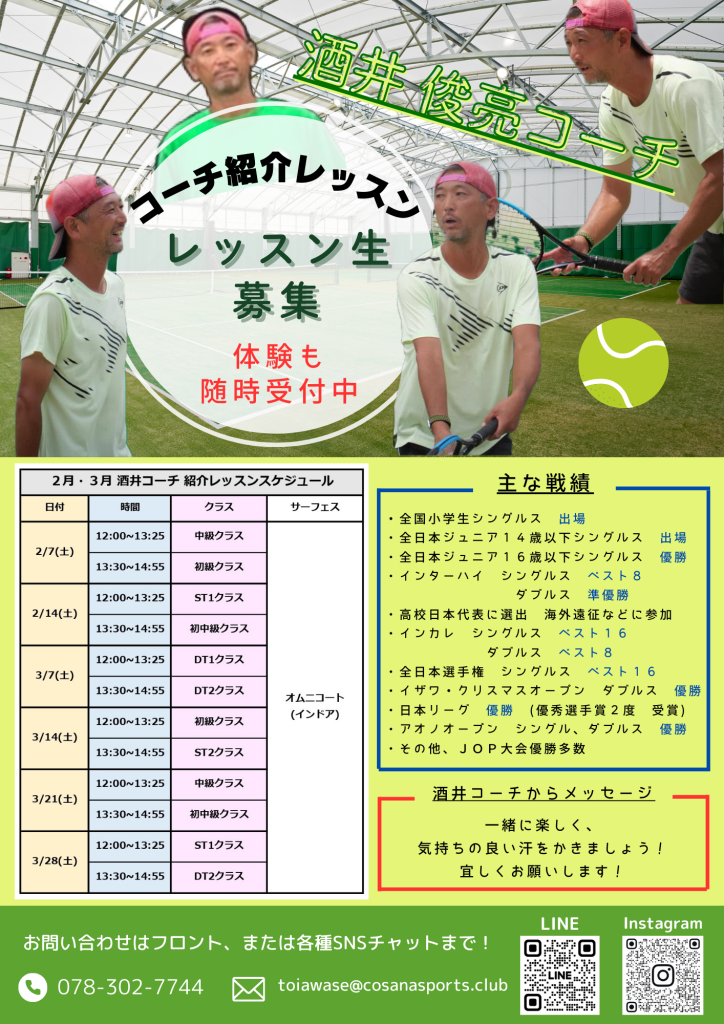 2月、3月は、酒井コーチの紹介レッスンを開催しております!