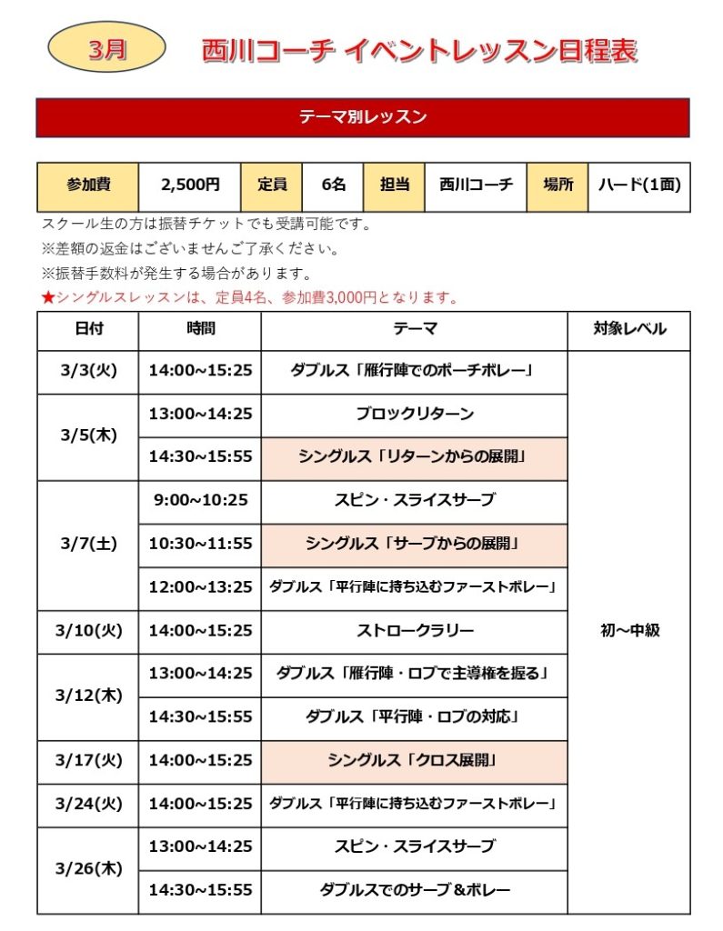 ※テーマ別レッスンは、スクール生の方は振替チケットの利用が可能です。